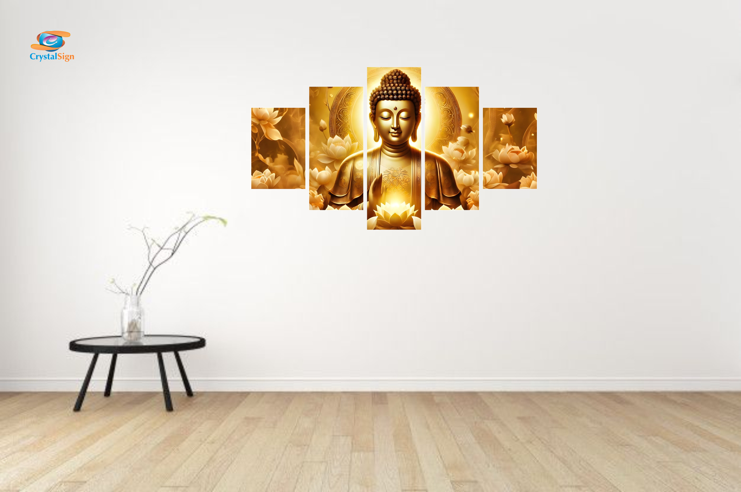 Bring home an aura of peace, enlightenment, and spiritual grace with CrystalSigns “Divine Serenity” five-piece wall art. Crafted with exquisite attention to detail, this radiant composition features Lord Buddha in a golden glow, surrounded by blossoming lotuses the eternal symbol of purity and enlightenment.