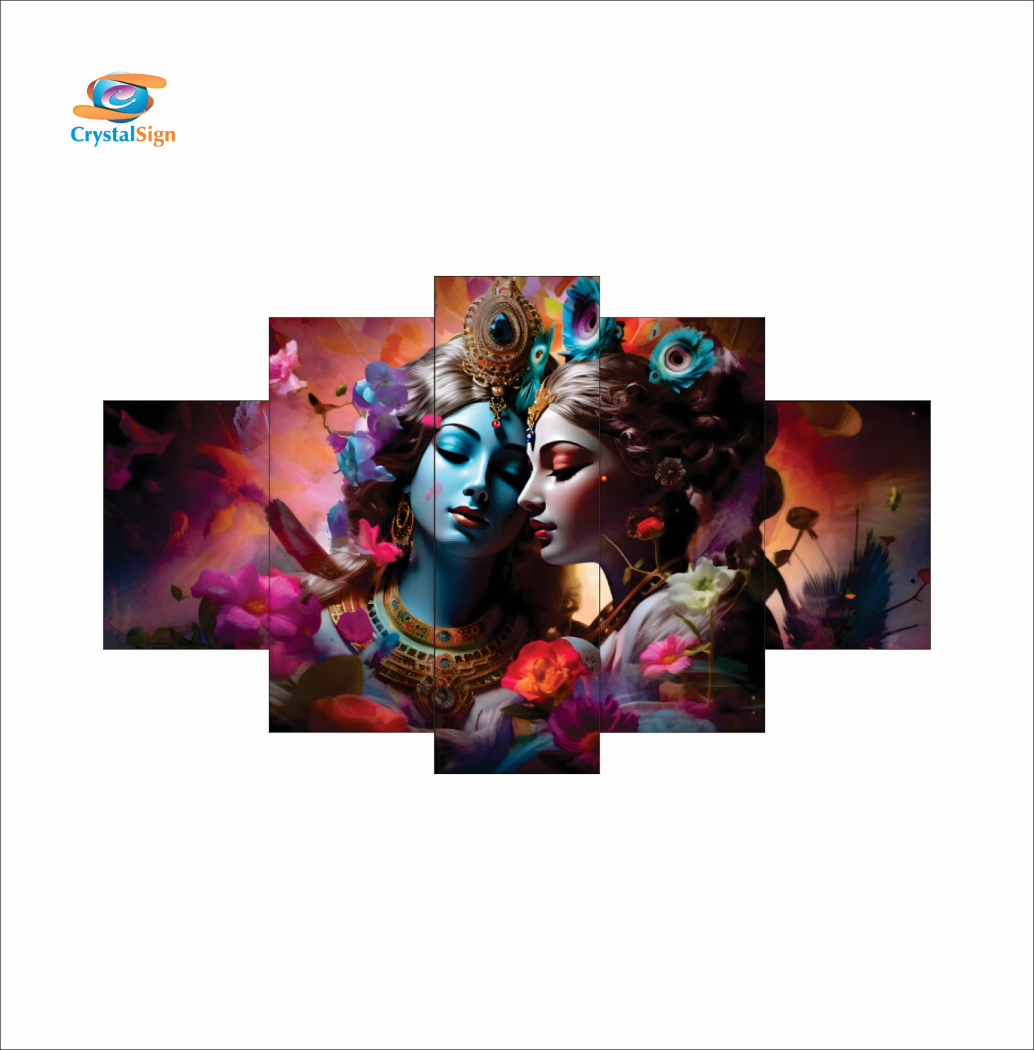 Celebrate the divine bond of eternal love with Crystal Sign’s “Eternal Love” five-piece masterpiece. This mesmerizing artwork captures the celestial romance of Radha and Krishna, surrounded by an enchanting burst of vibrant florals and rich, soulful hues. Every brushstroke reflects devotion, passion, and timeless beauty.