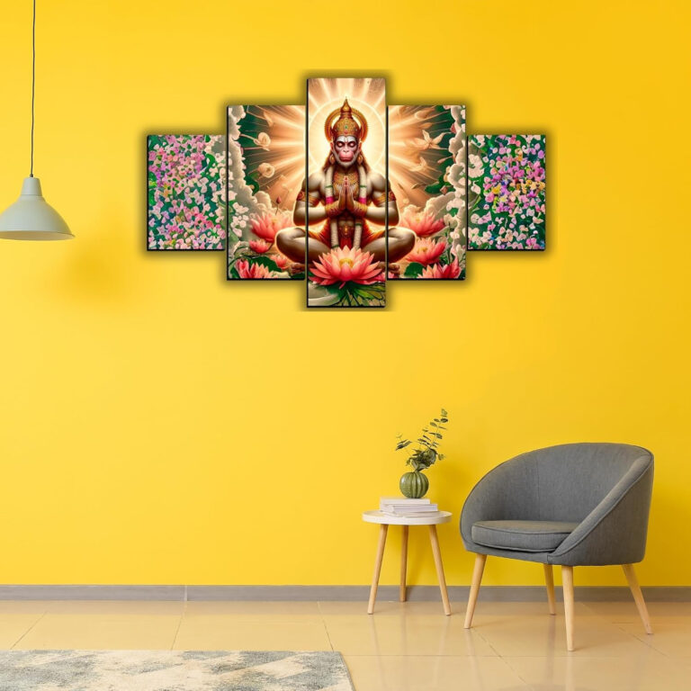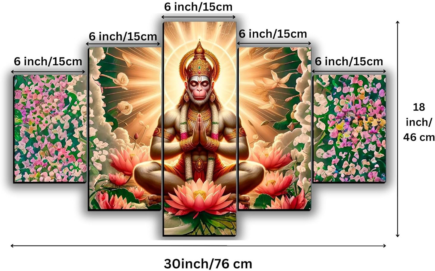 Bring divine energy and tranquility to your home with the CRYSTALSIGN Hanuman Ji Meditating 5-Piece Wall Painting Set. This elegant and lightweight wall art features Lord Hanuman in a peaceful meditative pose, surrounded by vibrant lotus flowers and radiant light, symbolizing strength, devotion, and serenity.