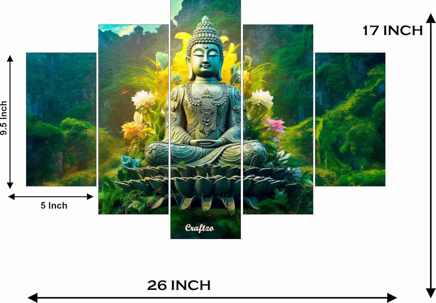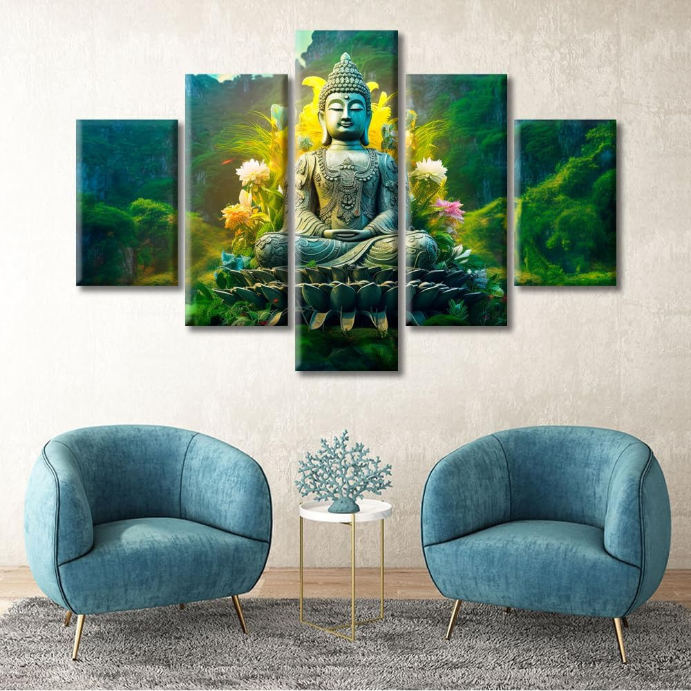 Infuse your home with serenity and spiritual harmony with the CRYSTALSIGN Gautam Buddha 5-Piece Multi-Panel Wall Painting. This exquisite artwork captures Gautam Buddha in a peaceful meditative pose, spreading an aura of calm and mindfulness in any room.