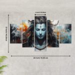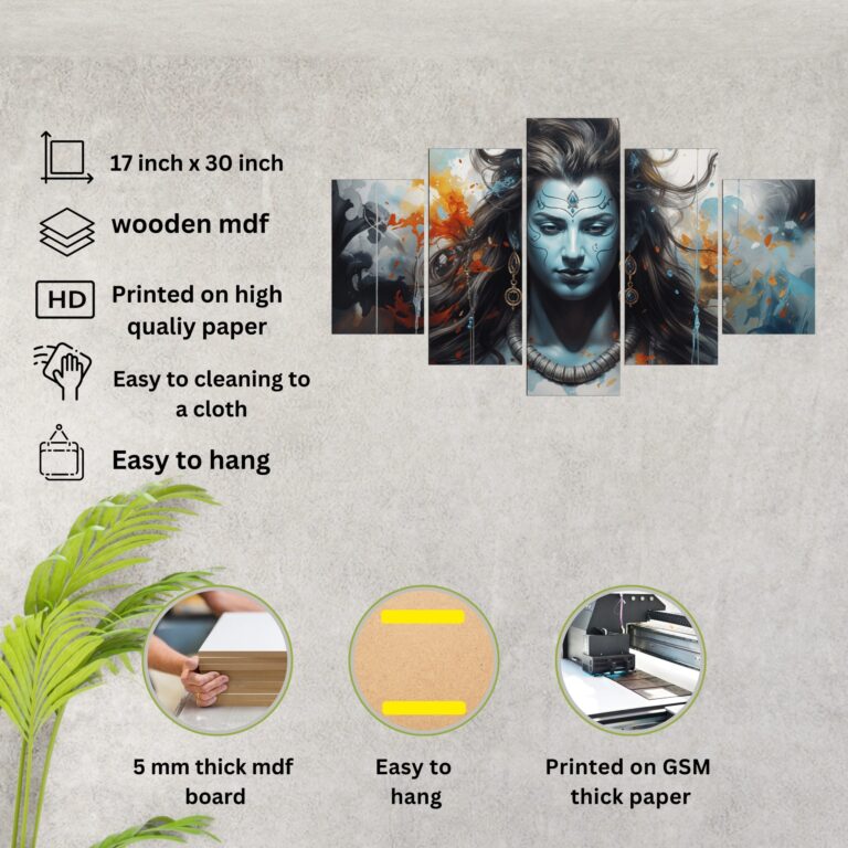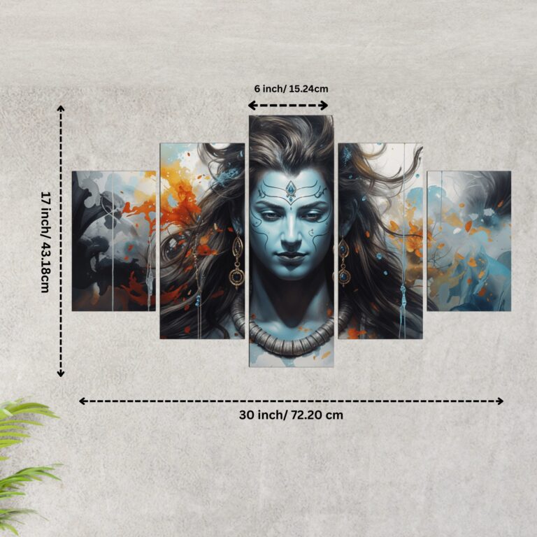 This beautiful 5 piece art will bring the serenity of Lord Saiva playing the flute right into your living room, bedroom or meditation area The vibrant blues and detailed floral accents make it the perfect piece for a peaceful and uplifting area The artwork is made from high quality material for colour and durability It easy to hang and maintain and is an excellent addition to any home or office décor If you are looking for a gift or just need a little uplift for your home